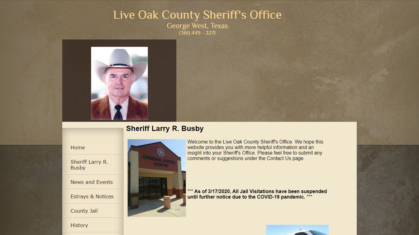 Welcome to the Live Oak County Sheriff's Office. We hope this website provides you with more helpful information and an insight into your Sheriff's Office. Please feel free to submit any comments or suggestions under the Contact Us page. *** As of 3/17/2020, All Jail Visitations have been suspended until further notice due to the COVID-19 pandemic.